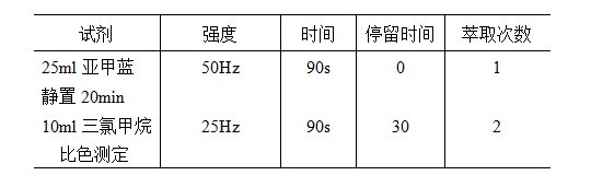 2. Add 25 ml of methylene blue, mix well, set the extraction instrument to 50 Hz, time 90 s, and let stand for 20 min.
